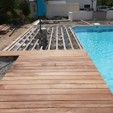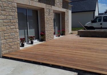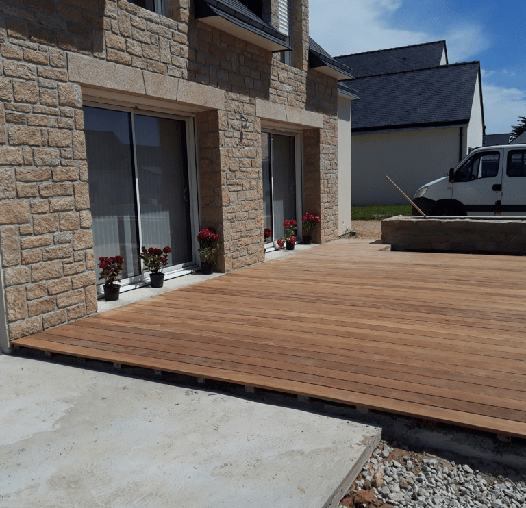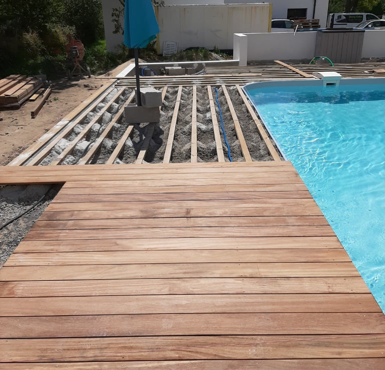 Réalisation du terrassement du terrain, dalle béton et pose parquet bois massif